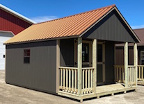 12x20' Cabin, 3/4" treated floor, 6'x78" swing doors, 2 4x12 lofts, (4) 24x27 windows, burnished slate siding,tavern Taupe trim, metallic copper roof, porch railings.