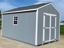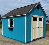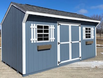 10x16 Quaker 3/4" treated floor, 2 18x27 windows, 5 doors, 12' ridge vent, flower boxes, blue,siding white trim , pewter shingles.