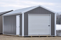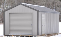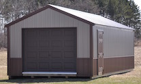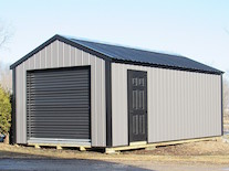 12x24'7' Gable , 3/4" treated floor, all metal sheeting, sides taupe, roof burnished slate, vented ridge light, 8x7 rollup door with garage tread plate, 8x12 loft, side entry door.