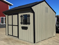 10x12' 6' Gable shed , 3/4" treated floor, painted prairie grass, black fox trim, burnt sienna roof, 5' double doors, tread plate.